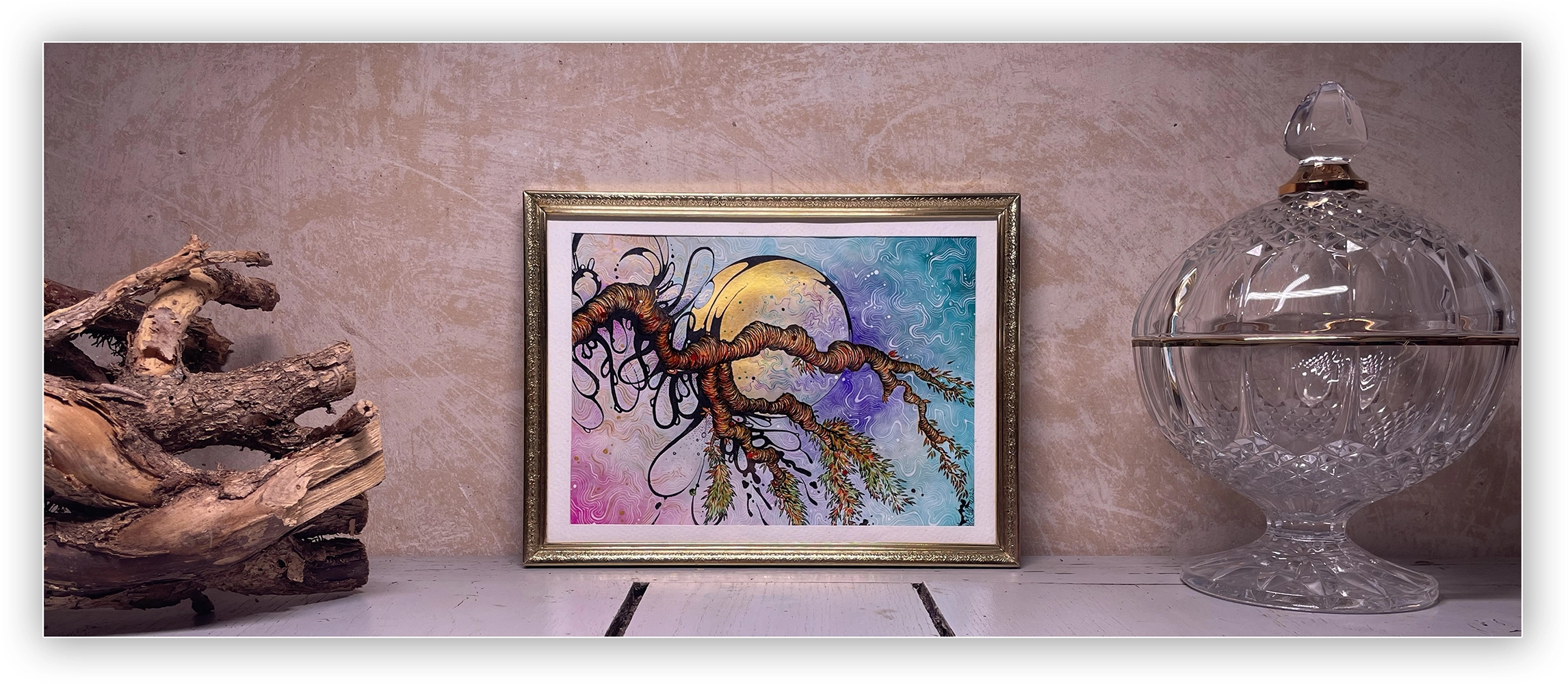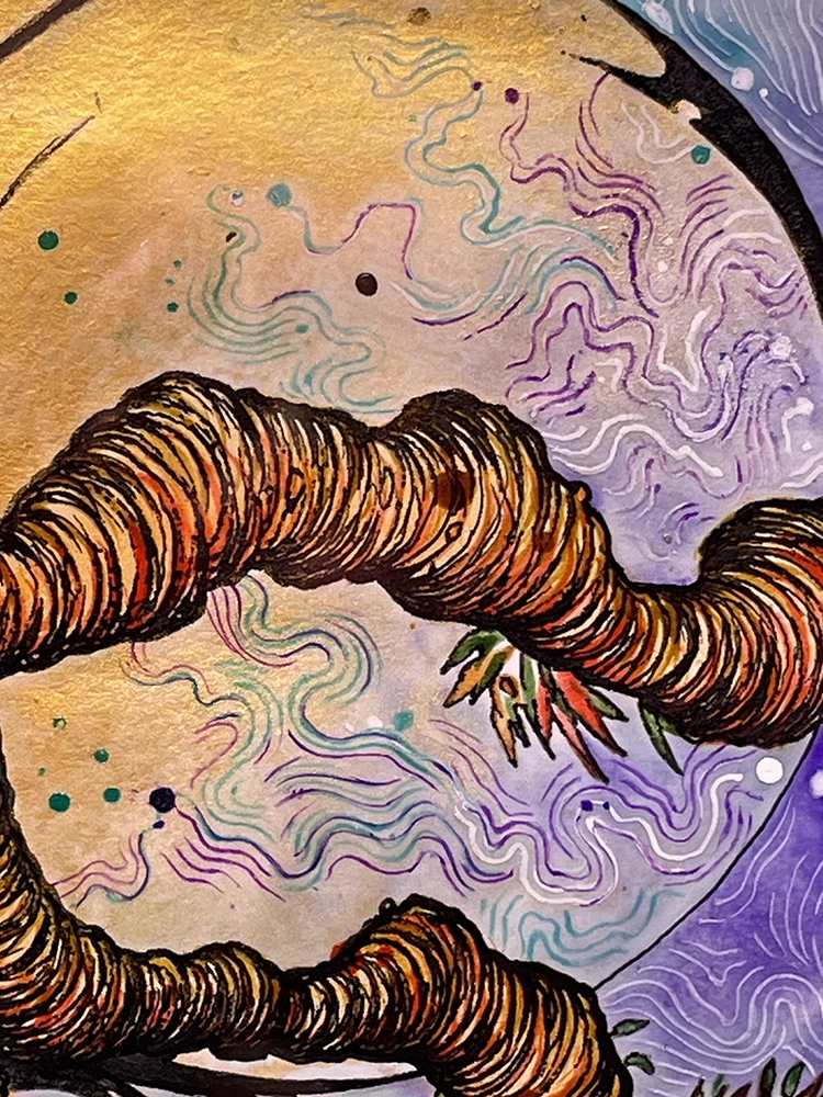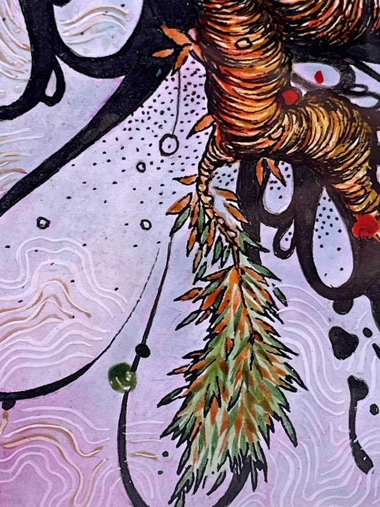 Carte bristol dessinée et peinte à l’encre, représentant une branche aux extrémités feuillues sur fond de brumes irisées et stylisées. Les éléments graphiques aux formes tentaculaires ou encore astrales, ajoutent une dimension mystique et intrigante à cette oeuvre.