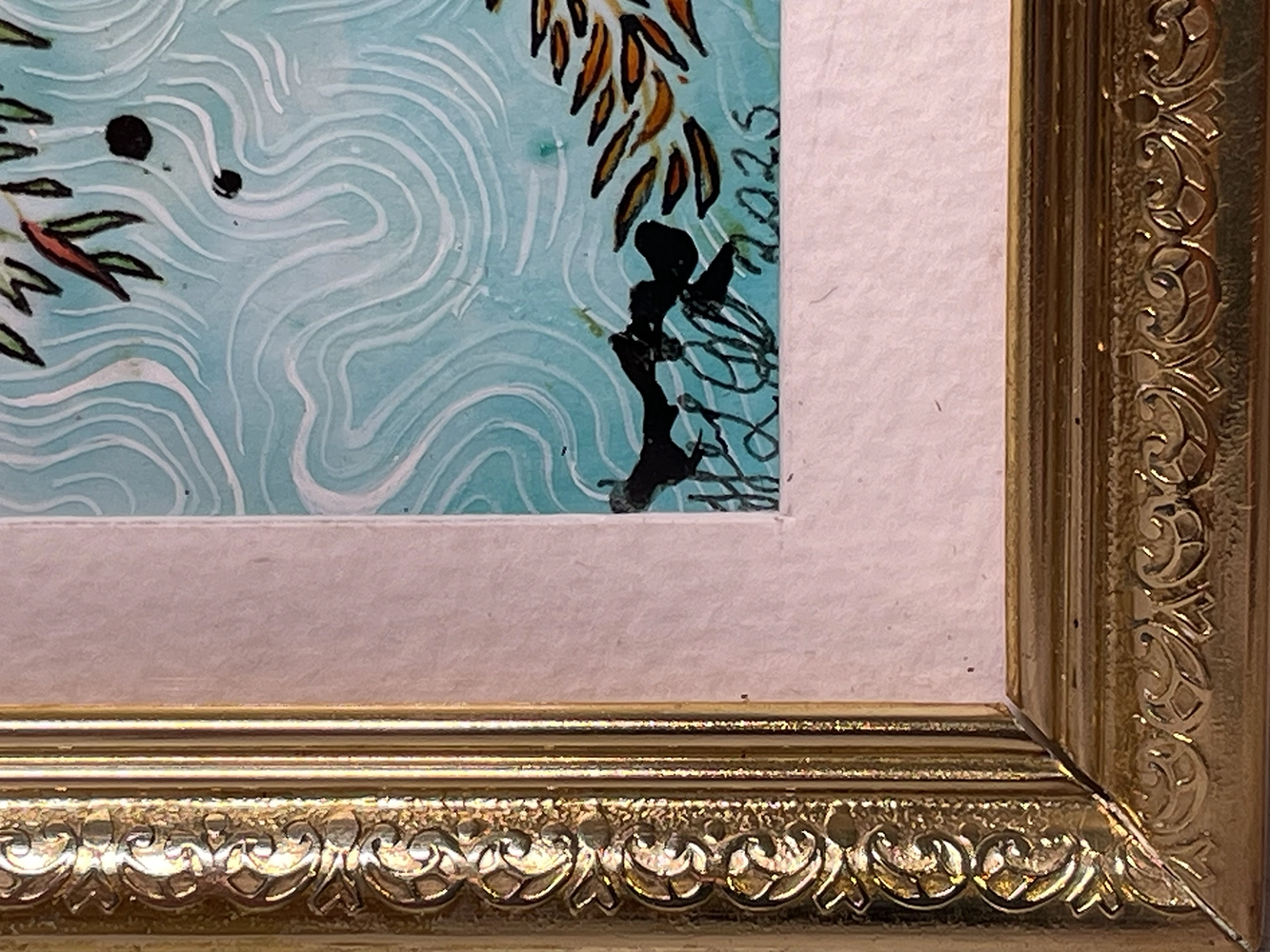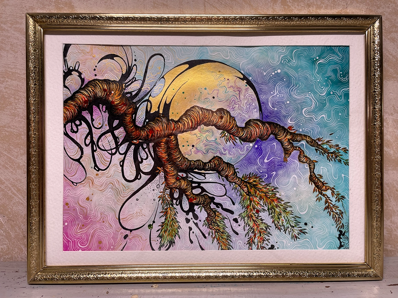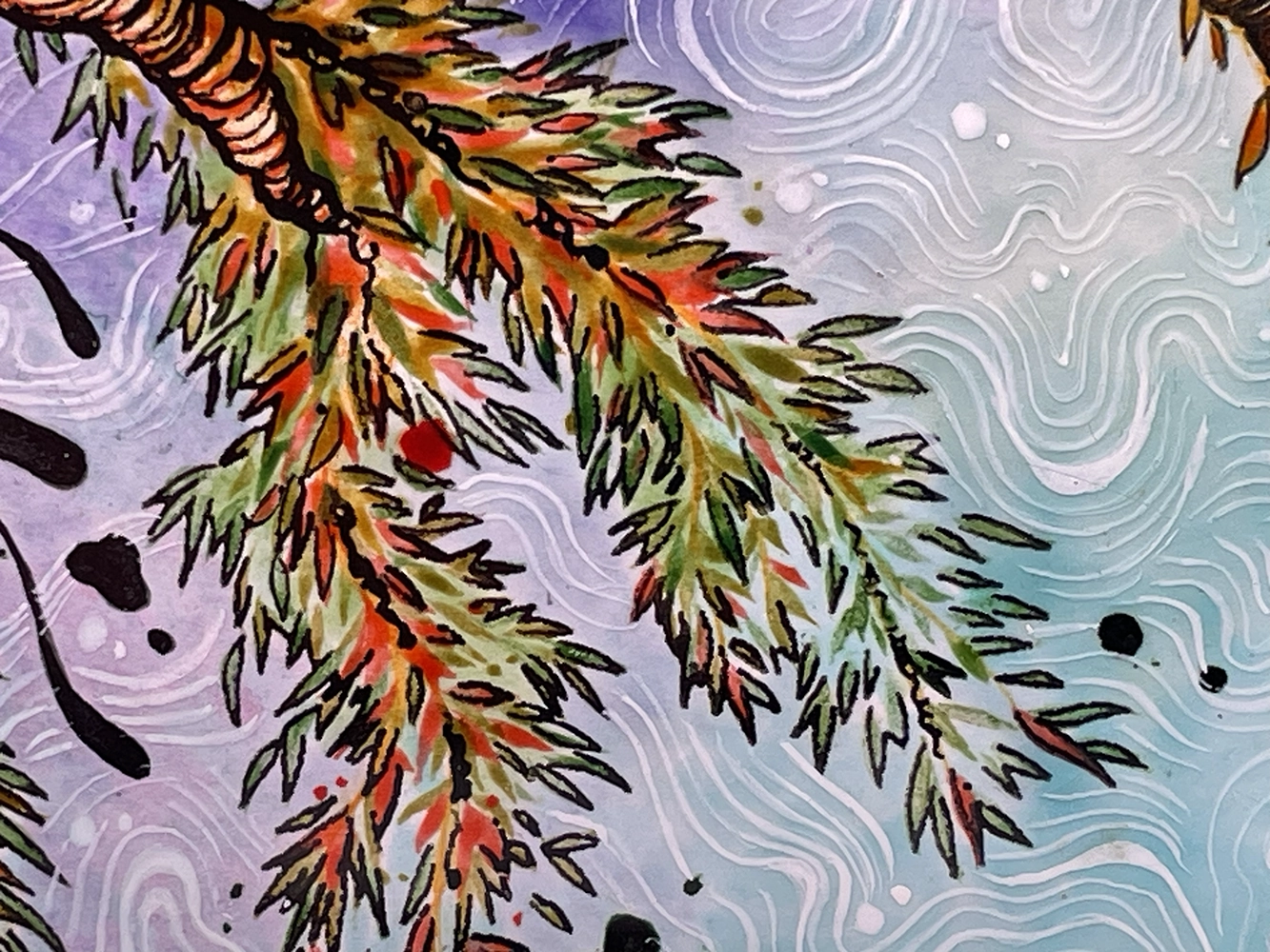 Carte bristol dessinée et peinte à l’encre, représentant une branche aux extrémités feuillues sur fond de brumes irisées et stylisées. Les éléments graphiques aux formes tentaculaires ou encore astrales, ajoutent une dimension mystique et intrigante à cette oeuvre.