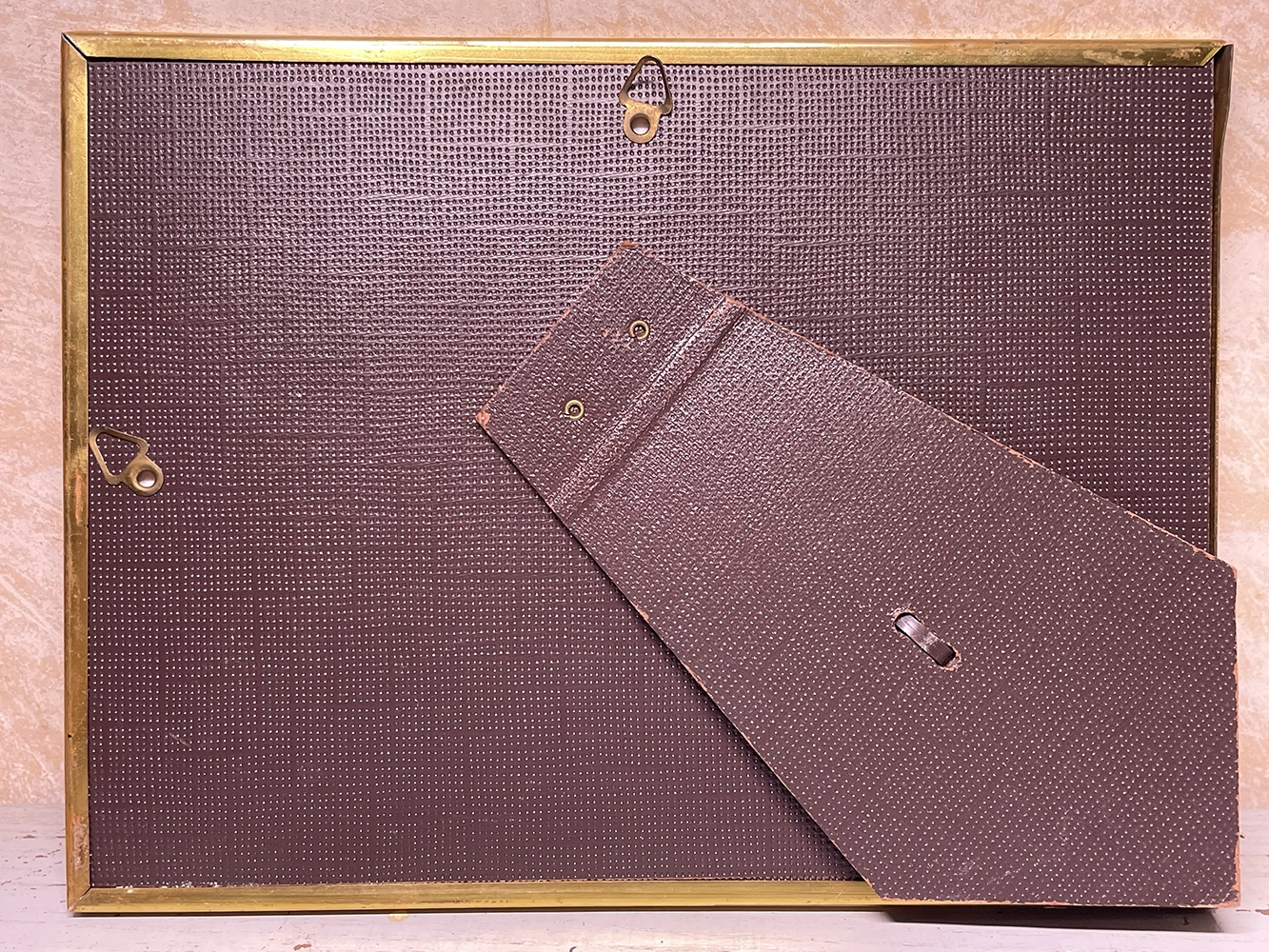 Encadrement vintage vitré, trouvé dans le grenier et restauré, métallique (laiton), avec petits motifs en relief.
